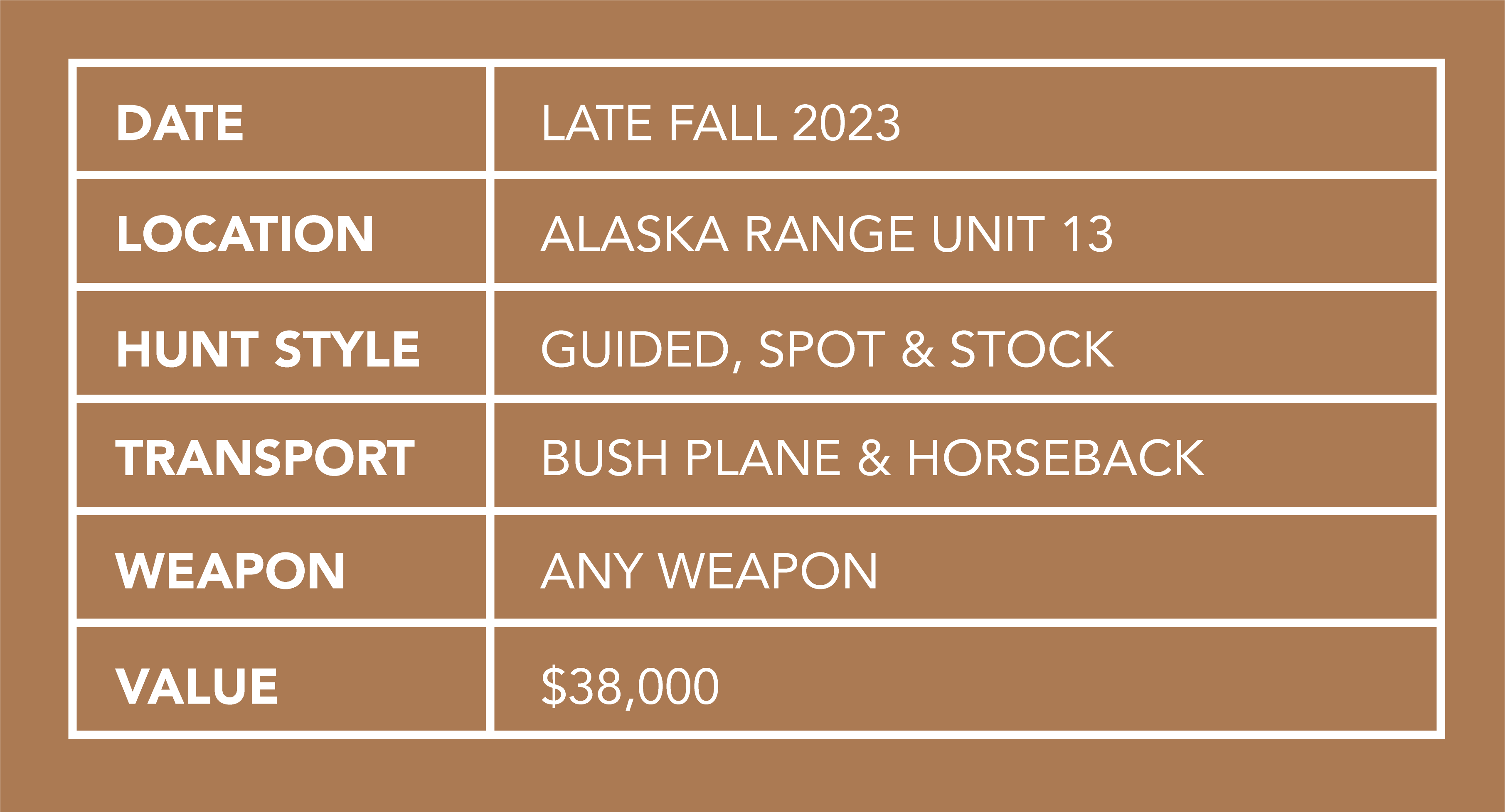 We partnered with Midnight Sun Safaris for a late fall 10- Day Dall sheep hunt in Range Unit 13. This hunt included the tag fee, lodging and food. Maximum entries sold were 2,500 entries giving you a 1 in 250 odds with 10 entries. This was by far the best odds in the industry for a hunt of this caliber.