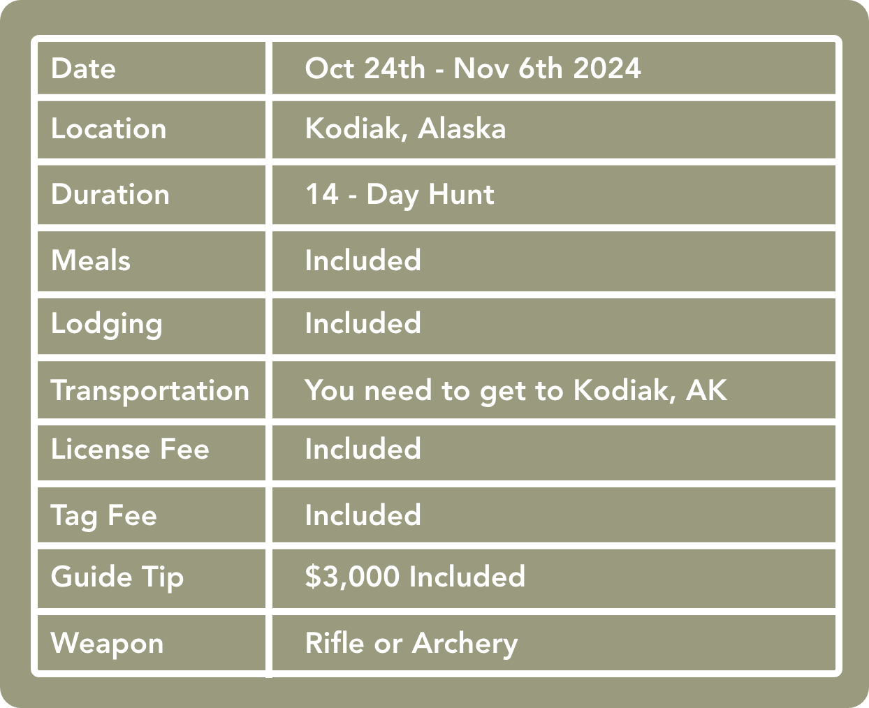 With Meals, Lodging, License, Tag Fee AND Guide Tip taken care of, this hunt boasts a worth $40,000!