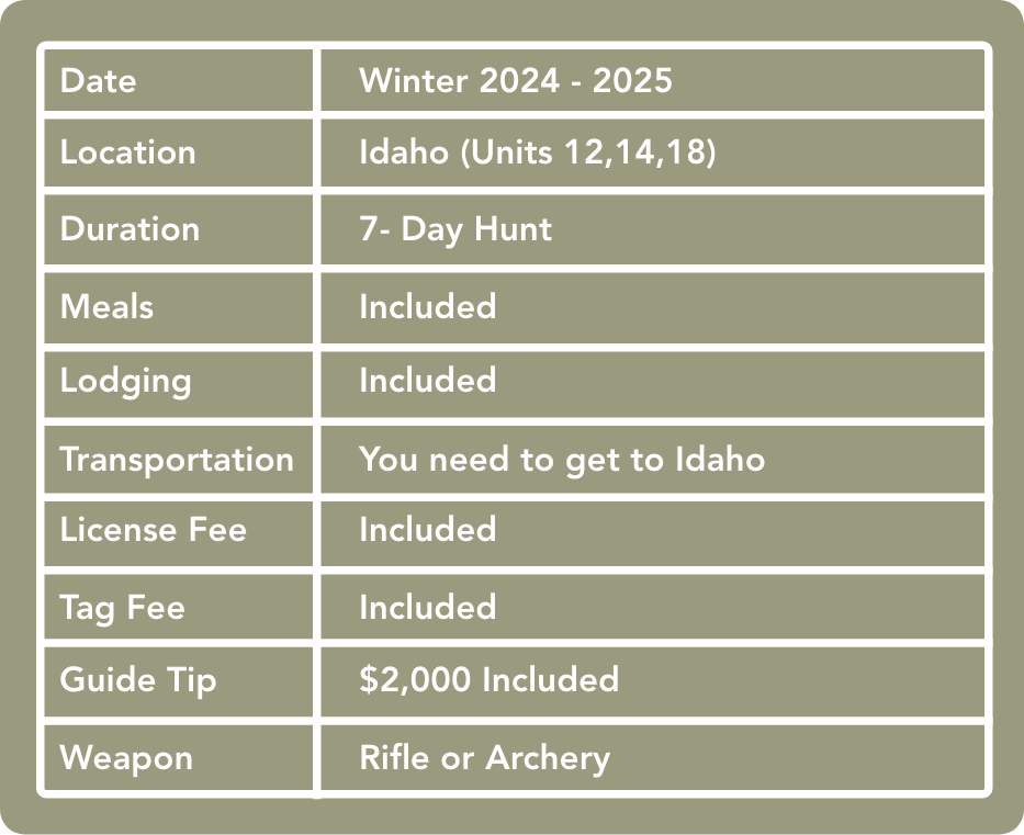 This charity mountain lion hunt includes: 7-Day Hung, Meals & Lodging, License & Tag as well a guide tip.