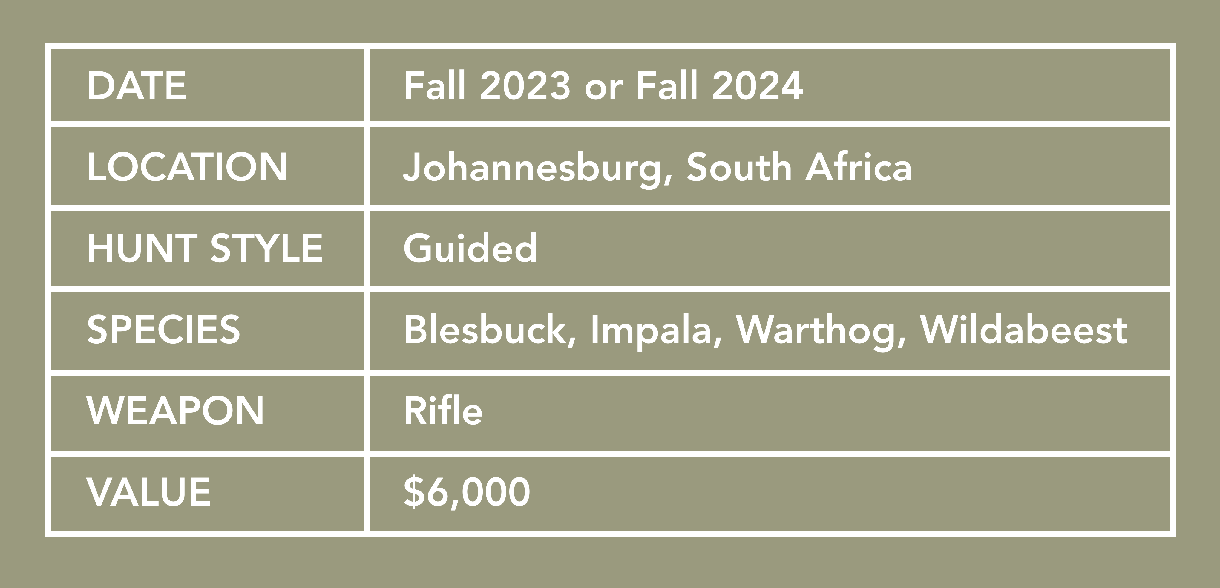 This charity 4-species hunt was donated by Johan Petzer Safaris and includes Blesbuck, Impala, Warthog and Blue Wildebeest.
